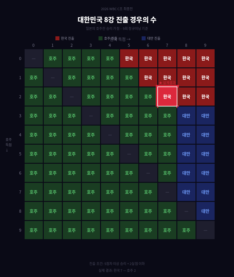 - 한국: 5점 차 이상 승리 + 2실점 이하