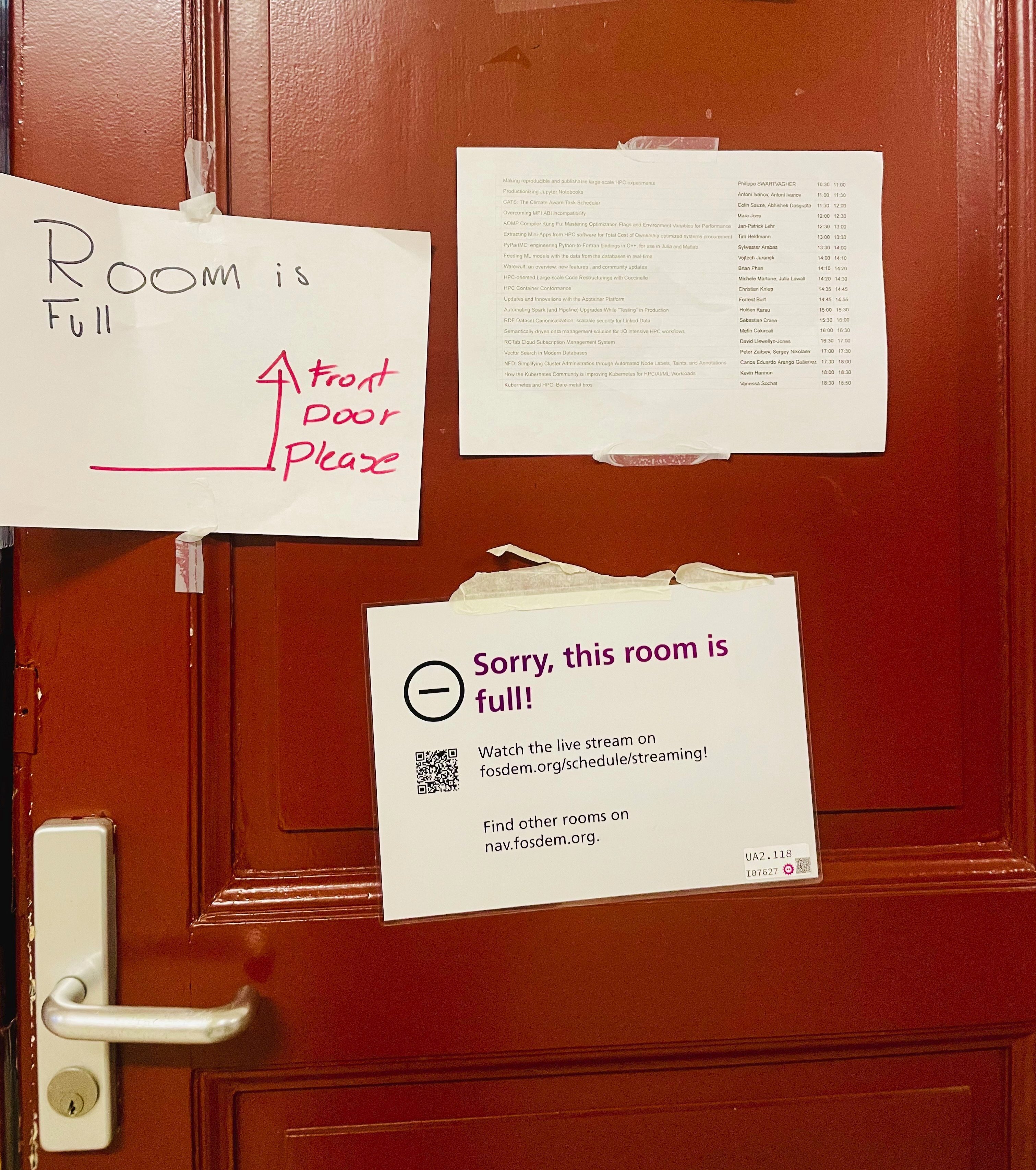 The schedule is organised into tracks/devrooms. Think of each devroom as a mini‑conference run by a specific community. Since many sessions happen at the same time, you’ll need to pick what you want to attend. Some rooms fill up quickly, so for must‑see talks it’s worth arriving 10–15 minutes early… otherwise you might be greeted by a “Room full” sign at the door.