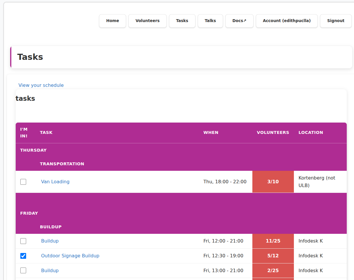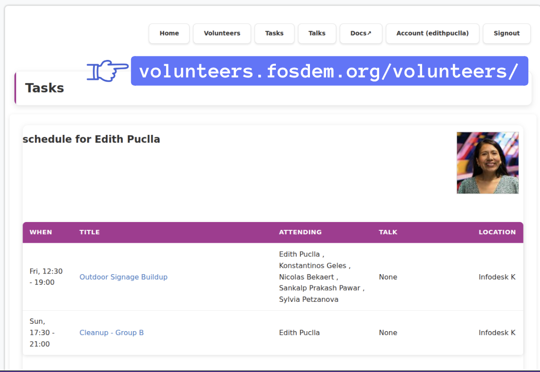 - Volunteers can choose tasks and shifts through the FOSDEM volunteer portal.