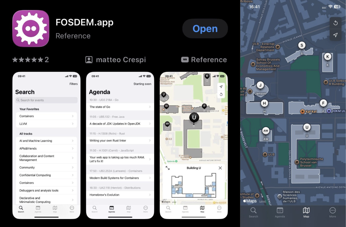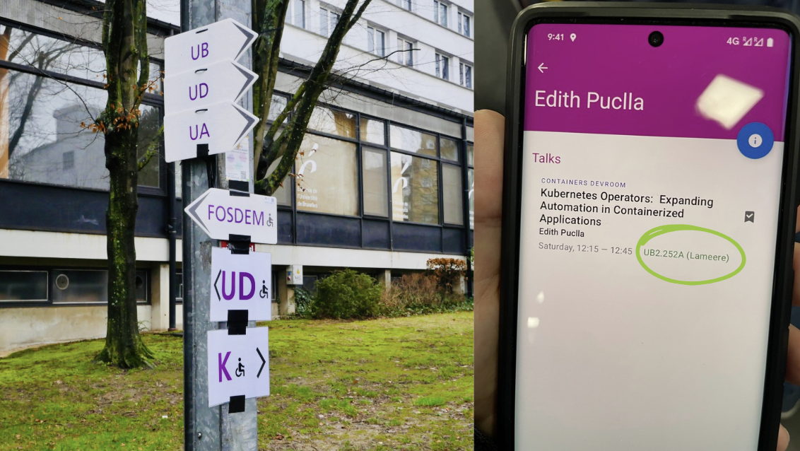 FOSDEM is spread over a campus with multiple buildings. Talks are distributed across those buildings, and the schedule tells you exactly which room. Every talk has a building and room name in the schedule, for example: