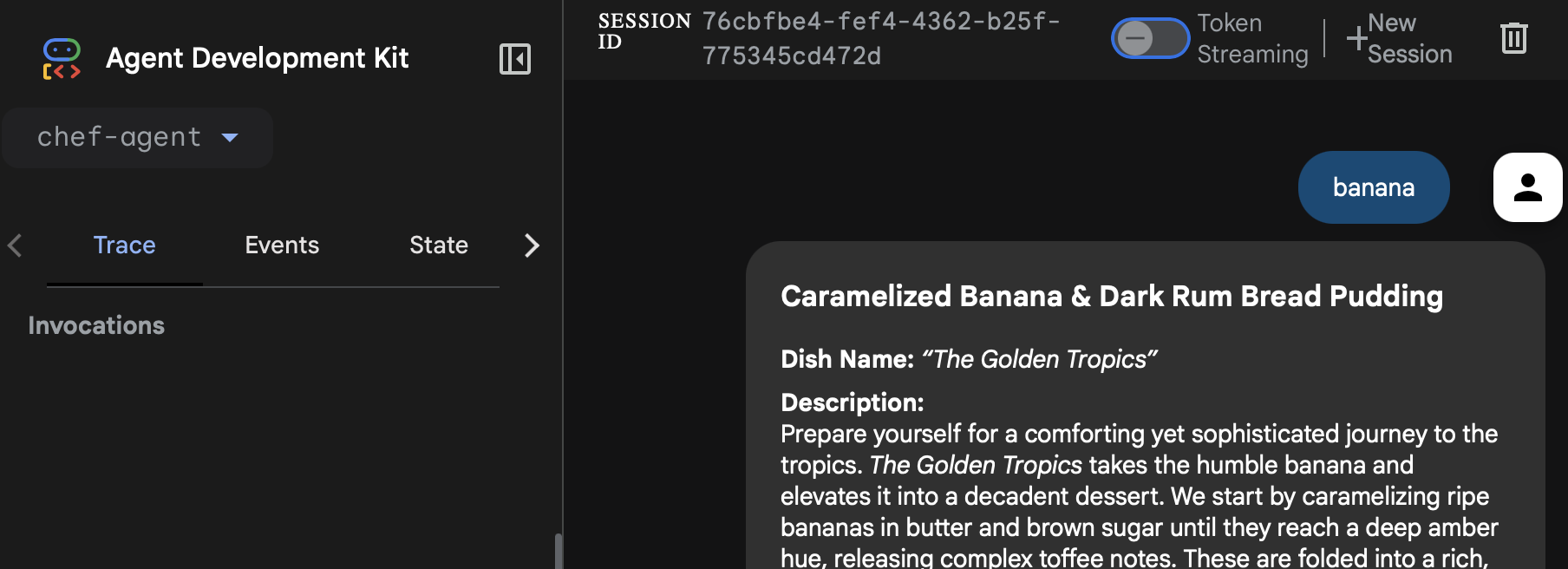 이 애플리케이션의 핵심은 chef-agent/agent.ts에 있습니다. 여기서 루트 에이전트는 Chef(요리사)로 정의되며, 단일 재료 입력을 받아 이름, 설명, 레시피, 그리고 플레이팅 지시까지 포함된 걸작 요리를 생성하도록 지시됩니다.