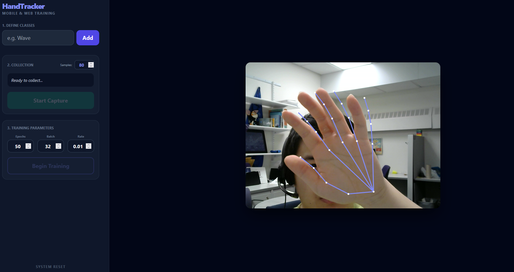 HandTracker라는 웹사이트를 만들었습니다. 이 사이트에서는 ml5.js를 사용해 직접 손 자세 모델을 학습시킬 수 있습니다. 원하는 제스처를 정의하고 원하는 대로 분류할 수 있습니다—예를 들어 “Hello” 제스처나 고죠의 시그니처 Domain Expansion: Infinite Void 제스처 등.