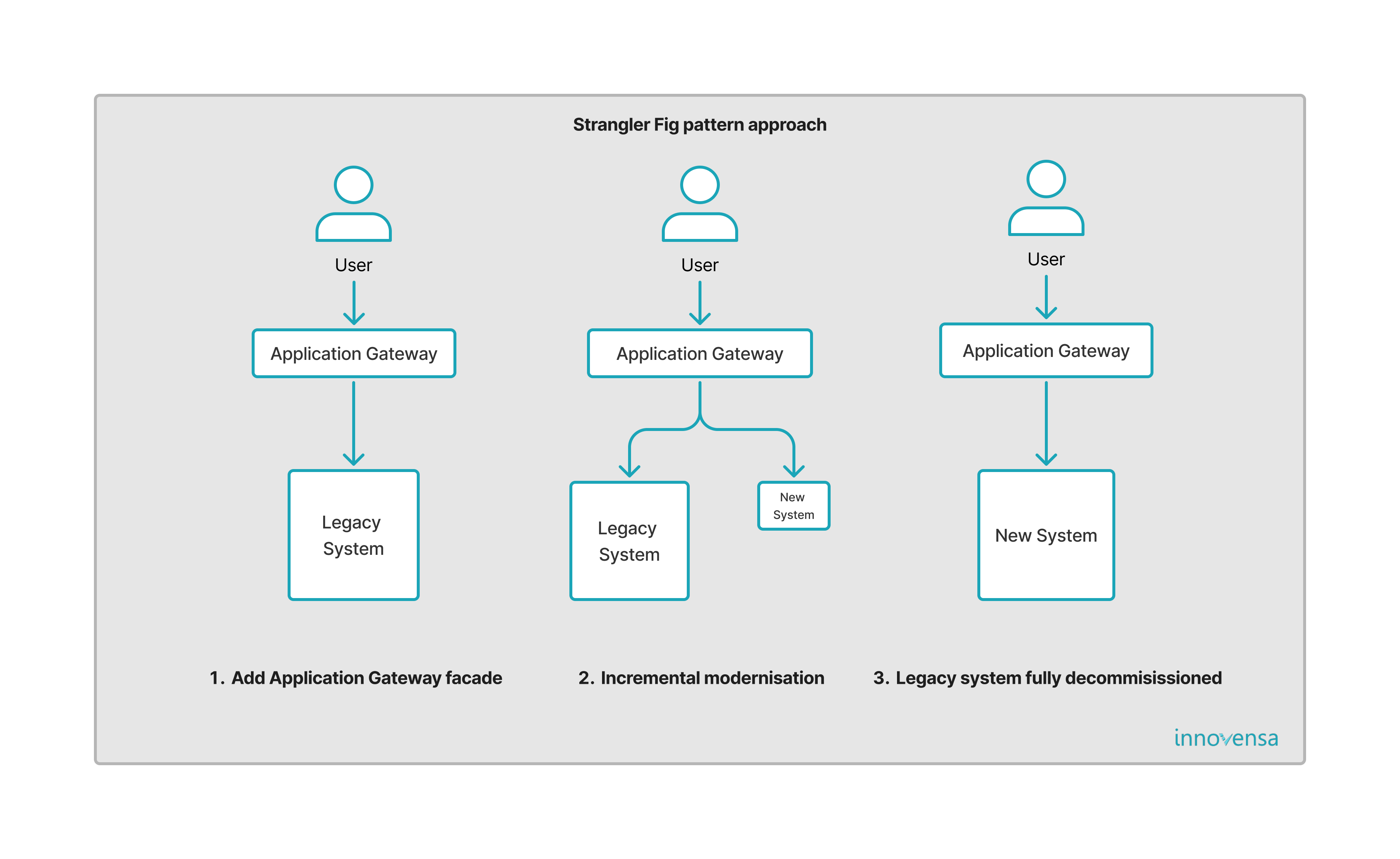 목표가 모놀리스를 모듈형 아키텍처로 현대화하는 것이라면, 가장 안전한 방법은 Strangler Fig Pattern입니다 – 이 개념은 Martin Fowler ↗(Strangler Fig Application)이 제안한 것입니다.