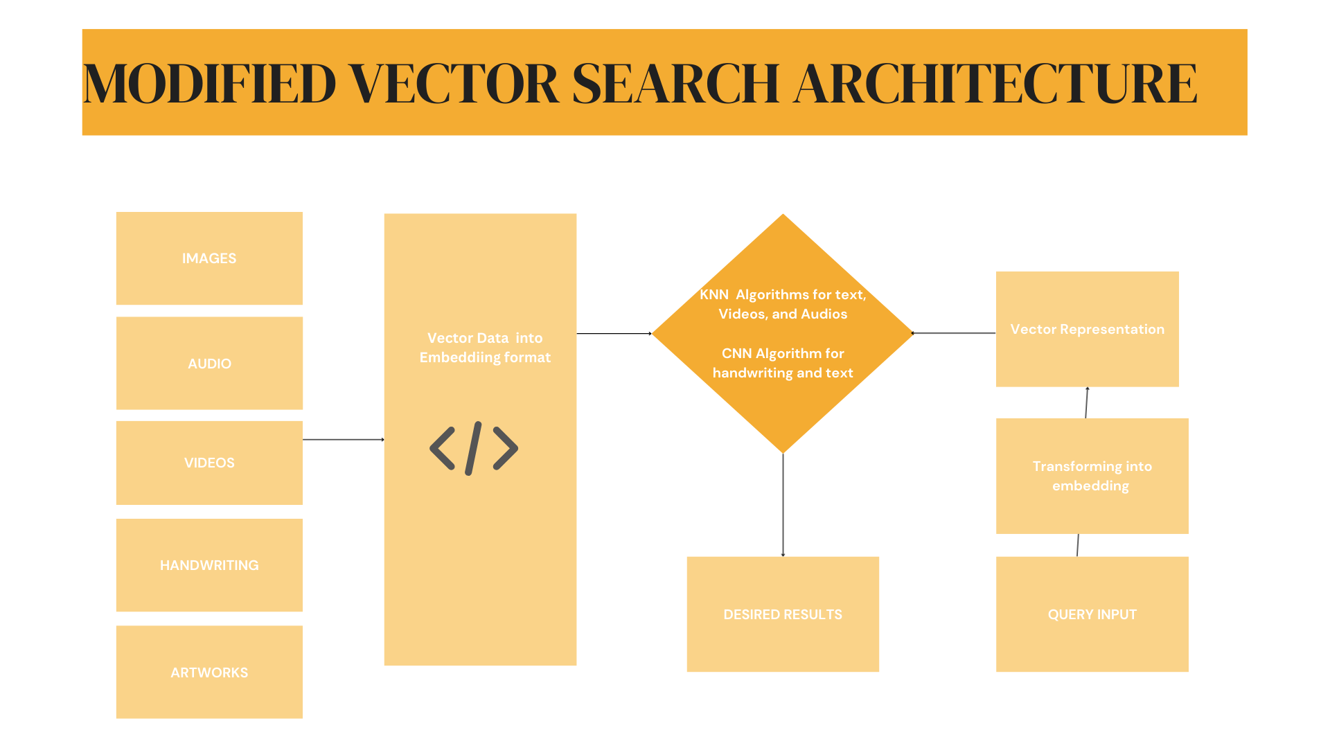 아래 다이어그램은 이제 이미지, 오디오, 비디오, 필기 및 아트워크를 입력으로 받아들이는 수정된 벡터‑검색 아키텍처를 보여줍니다.