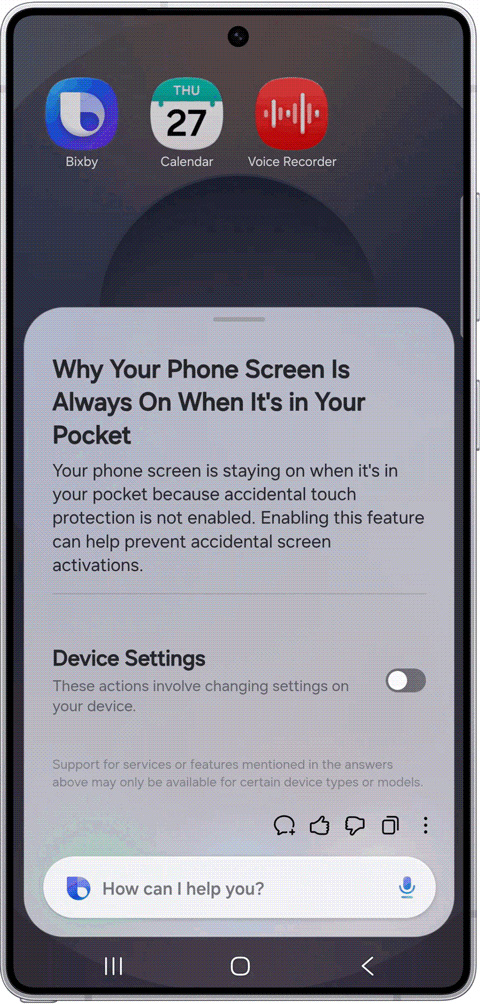- “사용자가 ‘왜 내 폰 화면이 주머니 안에 있을 때 항상 켜져 있지?’라고 물으면,” Bixby는 상황 맥락을 파악해 Accidental Touch Protection 같은 관련 설정을 제시하고, 바로 켤 수 있게 합니다.
