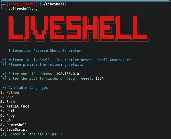 LiveShell 采用交互式、菜单驱动的界面,引导你完成反向 Shell 载荷的生成过程。无需再记忆复杂命令或手动编写载荷。只需提供 IP 地址、端口和语言,LiveShell 即可完成其余工作。